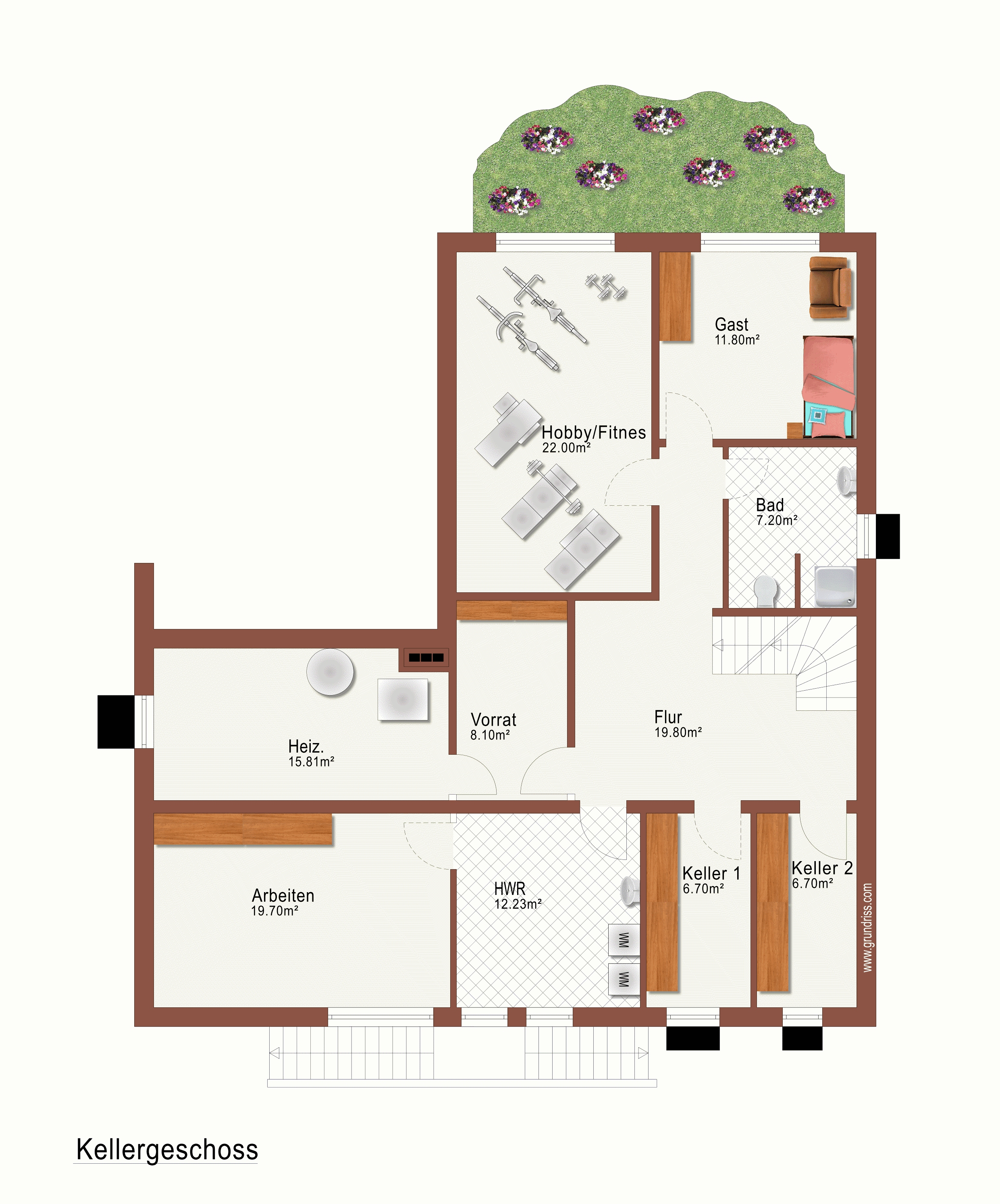Im Untergeschoss finden Sie ein geräumiges wohnlich ausgebautes Gästezimmer, ein Hobby- oder Fitnessraum und ein mögliches Arbeitszimmer. Alle Räume sind beheizt und mit Tageslicht ausgestattet. Ein weiteres Duschbad, Hauswirtschaftsraum und verschiedene Abstellkeller befinden sich ebenfalls auf dieser Ebene. Vom Hauswirtschaftsraum aus führt eine Außentreppe in den Gartenbereich.
