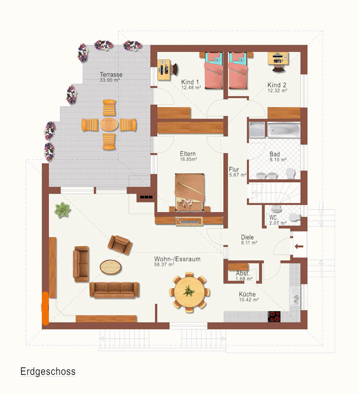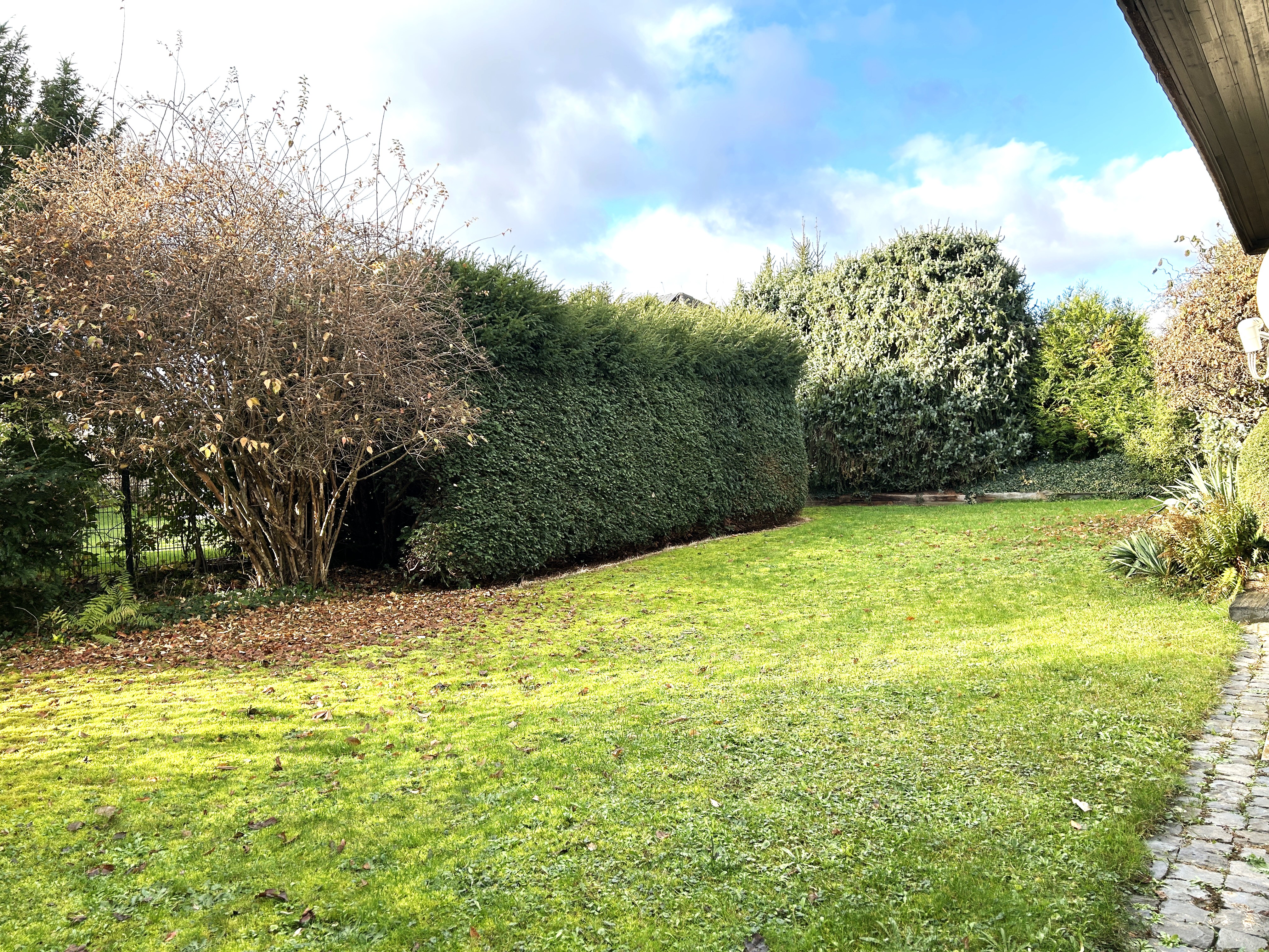 Diese besondere Immobilienofferte richtet sich an Familien und Paare, die großzügig auf einer Ebene wohnen möchten und an einem außergewöhnlich großen und blickdichten Garten Spass haben.